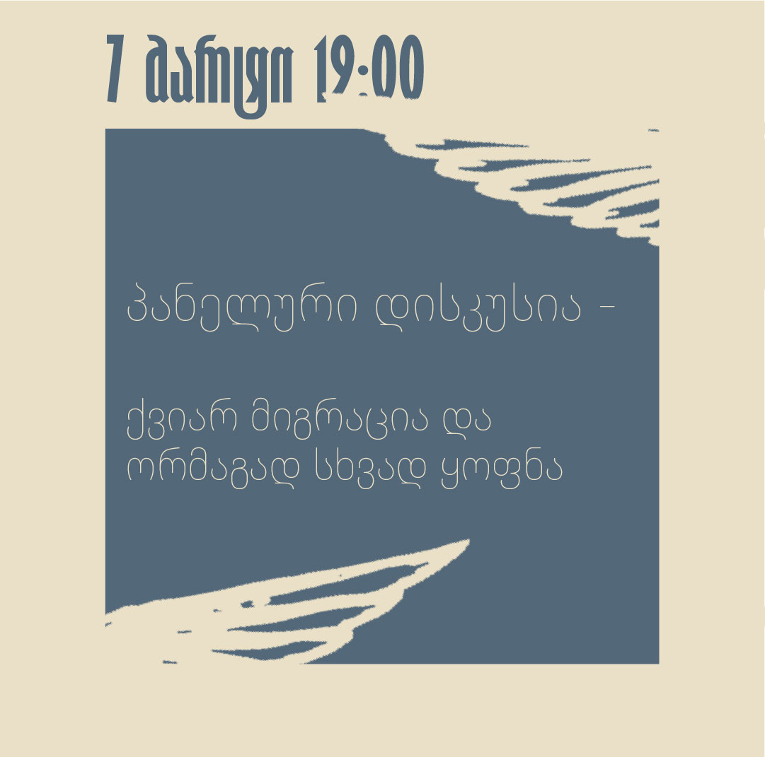 ფესტივალი ქვიარ მიგრაციის თემაზე რამდენიმე კინოსეანსით 7 მარტს გაგრძელდება. საღამო დასრულდება დისკუსიით “ქვიარ მიგრაცია და ორმაგად სხვად ყოფნა”